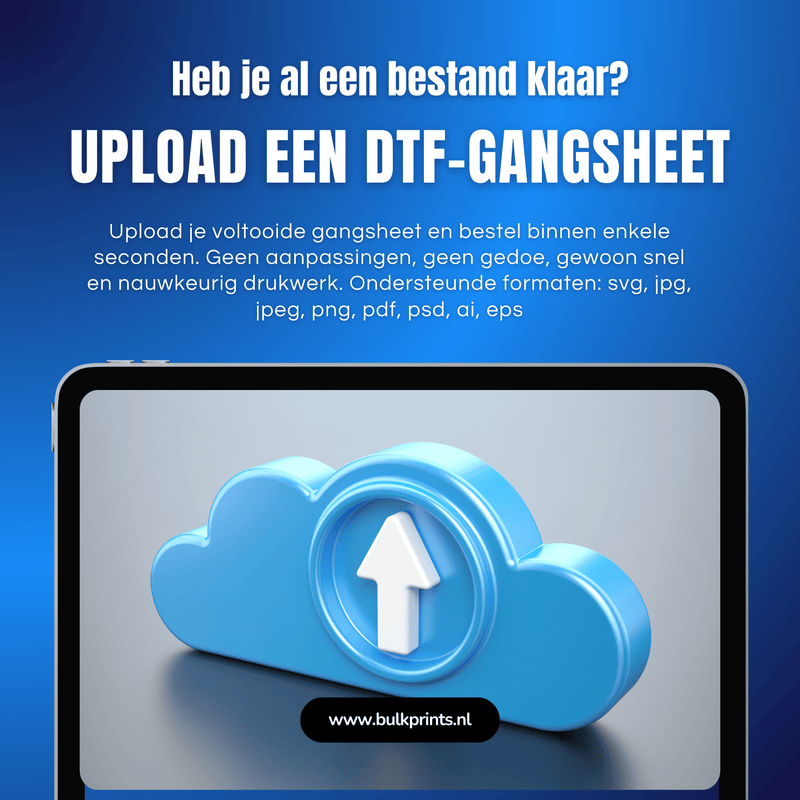 Voor degenen die liever hun eigen software gebruiken: u moet printklare bestanden aanleveren. Upload bestanden in de formaten .PNG, .PDF, .PSD, .AI en .EPS.