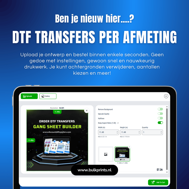 Dit bespaart geld en maakt printen sneller. Perfect voor grote bestellingen en terugkerende opdrachten. Maak eenvoudig aangepaste gang sheets met onze professionele builder. Ontwerp, rangschik en optimaliseer uw prints voor maximale efficiëntie en kwaliteitsresultaten!