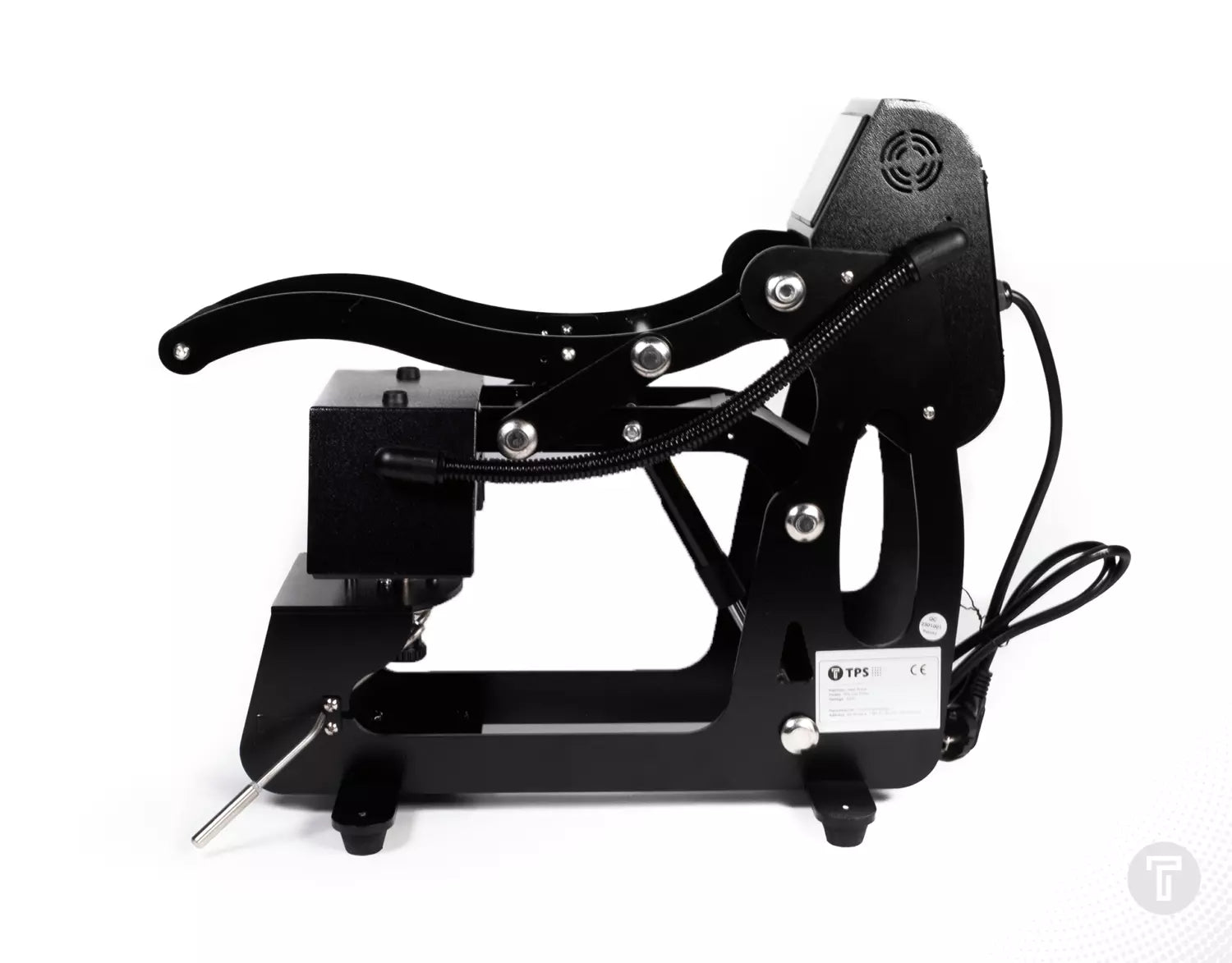 De cap-hold down hendel zorgt ervoor dat petten eenvoudig op hun plaats blijven liggen, voor perfecte precisie. De TPS Cap Press heeft een volledig digitale tijd en temperatuur display. De druk kan eenvoudig worden aangepast via de draaiknop onder de onderplaat.